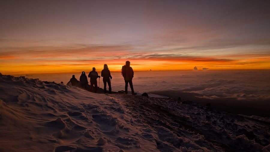 Shortly after midnight, begin the summit ascent toward Stella Point (5,756 m), moving slowly in the cold and darkness. From here, you continue along the crater rim to Uhuru Peak (5,895 m), the highest point in Africa, arriving around sunrise.