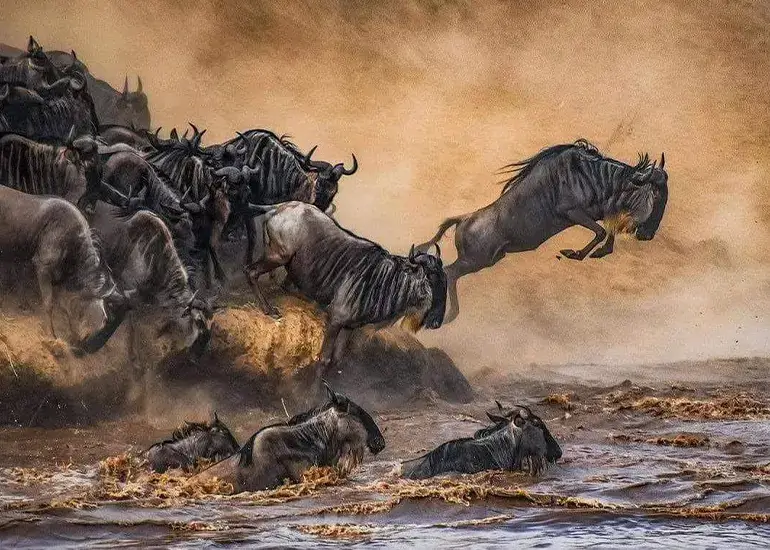Witness the awe-inspiring spectacle of the Great Migration, where millions of wildebeests and zebras